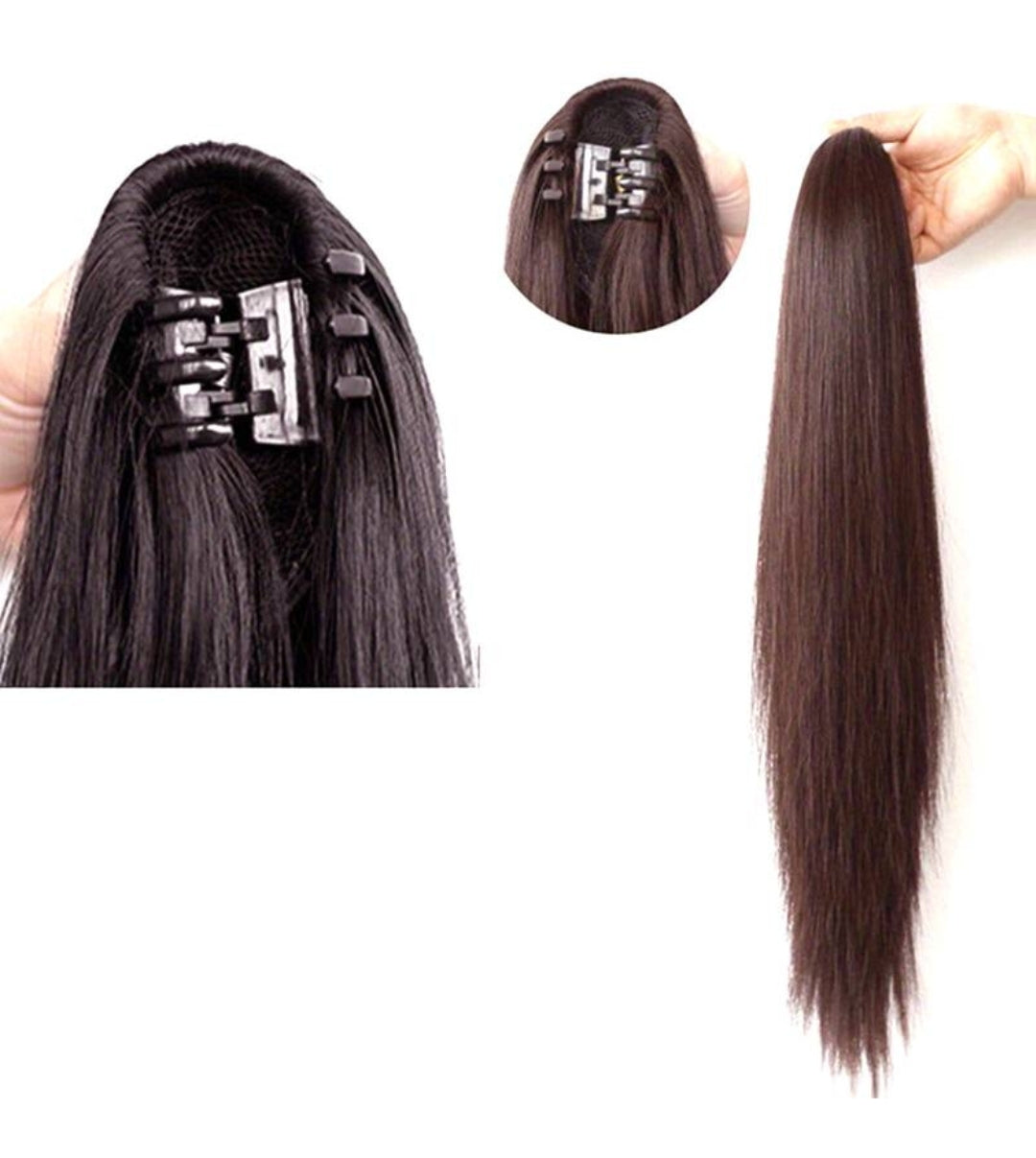 Het synthetische haar is voorgestileerd en super eenvoudig te bevestigen met behulp van een klem - klem het eenvoudig over de bovenkant van je natuurlijke knotje/staart .